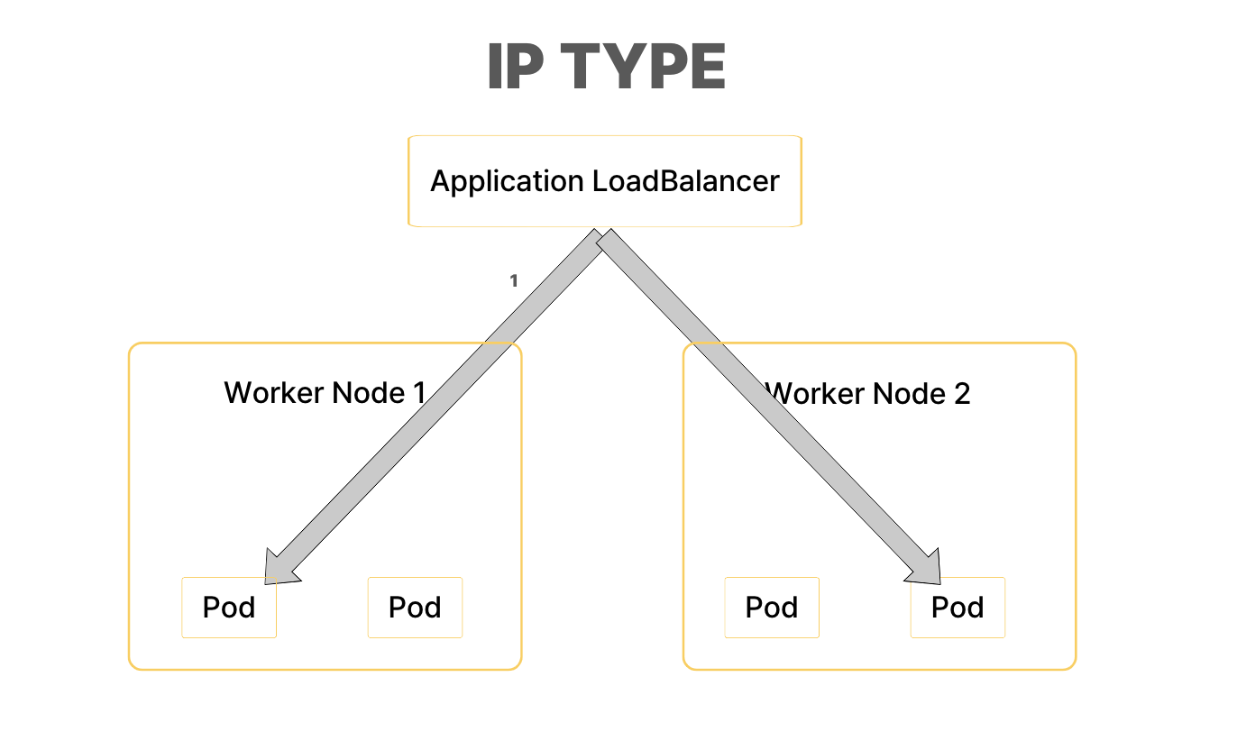 ip 타입은 타깃 그룹에 파드를 직접 등록한다. 따라서 instance타입과 다르게 노드를 거치지 않고, 파드로 직접 전달된다. 플로우는 아래와 같다.