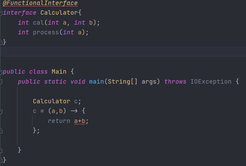 Calculator lambdaCalculator = (a,b) -> { // 추상 메소드를 람다식으로 표현