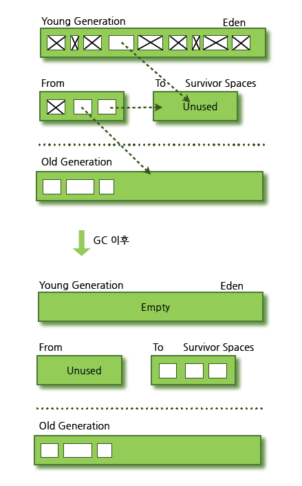 4. 하나의 Survivor가 가득 차게 되면 그중에서 살아남은 객체들을 다른 Survivor로 모두 이동시킵니다. 그렇다면 가득 찼던 Survivor 영역은 빈 상태로 바뀌게 됩니다.