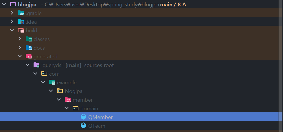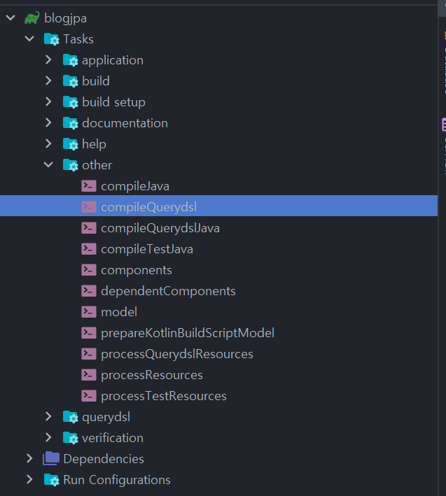 위에서 Querydsl을 사용하기 위한 세팅은 모두 끝났습니다. 우측 gradle 탭에서 other -> compileQuerydsl을 누르시거나 애플리케이션을 실행시키면, Build가 됩니다. 위에서 지정한 querydslDir에 Q타입이란 것이 생깁니다.