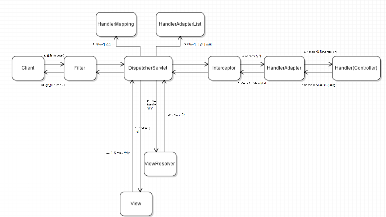 - Client로부터 요청을 받을 시 Filter를 거쳐 통과되는 요청은 DispatcherServlet에게 전달됩니다.