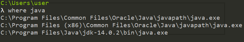 where java // 명령어를 입력하면 java의 디렉터리 위치가 나옵니다.
