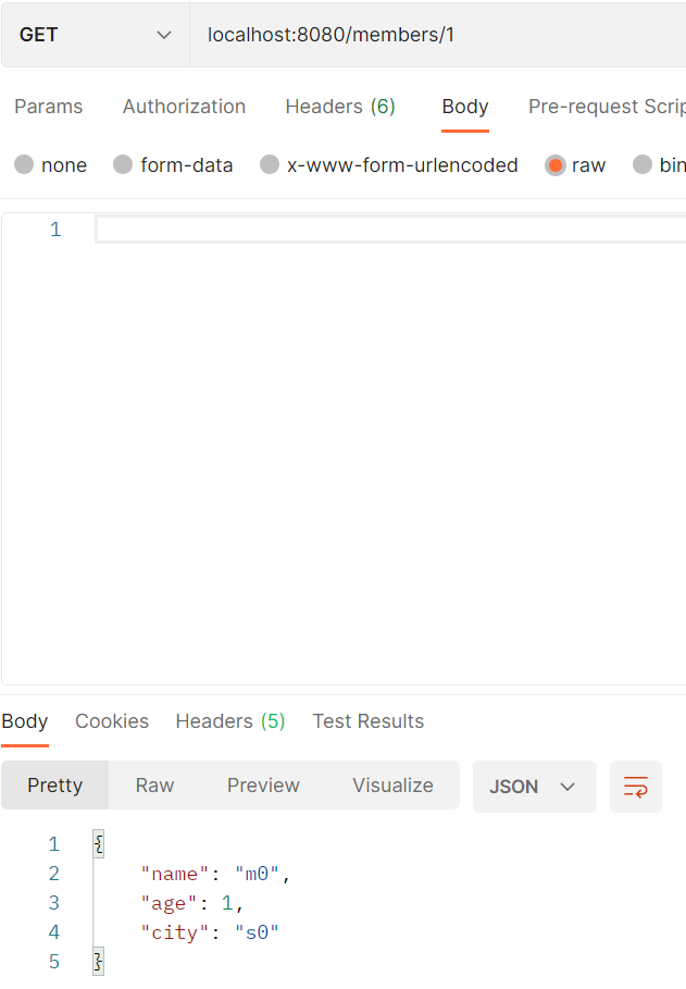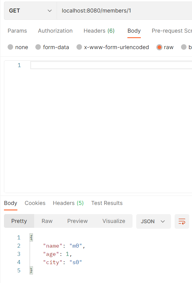 먼저 localhost:8080/member/1로 요청을 보내겠습니다. 쿼리가 수행되고, 결과를 받으실 수 있을 겁니다.