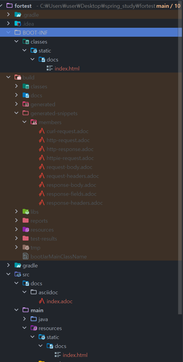 아래와 같이 모두 index.html과 build/generated-snippets/members에 adoc이 생성됐는지 확인하고, index.html을 열어 확인합니다.